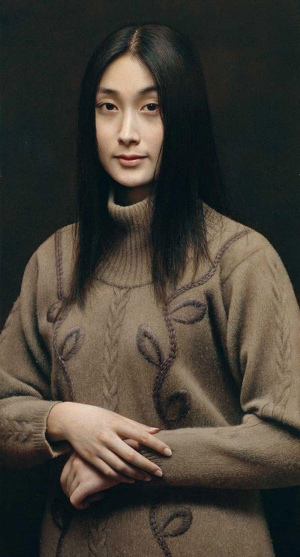 Below is arguably one of Jun’s most famous art pieces which has been deemed one of the most realistic oil paintings ever by many articles. The detail also presented below shows the smallest fragments of hair on the sleeve of the sweater. The more you look, the harder it is to distinguish picture from real life. I will save you my thoughts on it and let you garner your own thoughts and feelings while looking at the whole piece and then the details.
